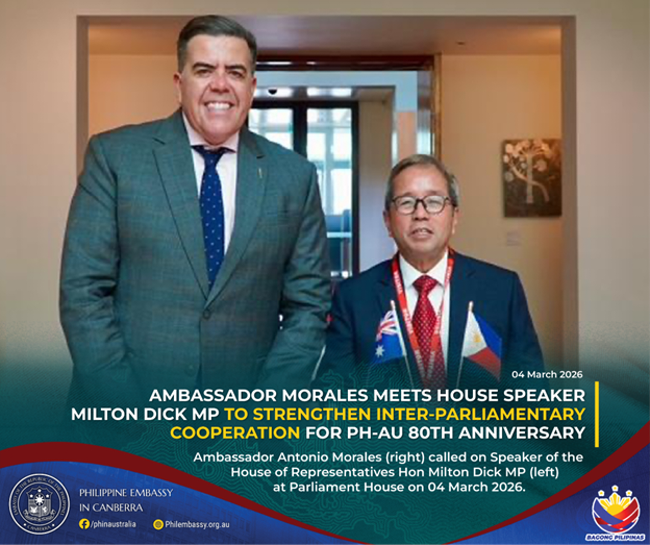 04 MARCH 2026, CANBERRA – Philippine Ambassador Antonio A. Morales met with Hon Milton Dick MP, Speaker of the Australian House of Representatives, at Parliament House to reaffirm the strong parliamentary ties between the Philippines and Australia as the two countries mark the 80th anniversary of diplomatic relations in 2026.