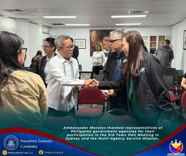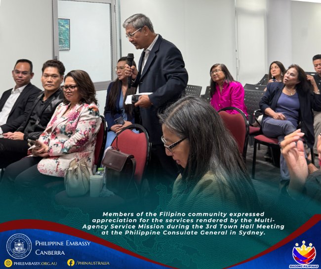 Hosted by the Philippine Consulate General in Sydney, the third Town Hall is part of the Multi-Agency Service Mission (MASM), which brought together the Filipino community and representatives from Philippine government agencies to discuss available services and community-driven proposed projects.