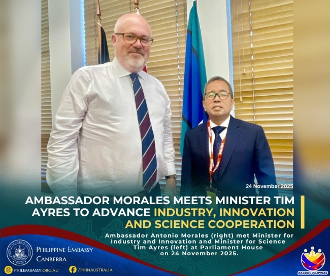 24 November 2025, CANBERRA – The Philippine Ambassador to Australia, H.E. Antonio A. Morales, met with the Hon. Tim Ayres, Minister for Industry and Innovation, Minister for Science, and Senator for New South Wales, at Parliament House to discuss strengthening trade, investment, and economic cooperation between the Philippines and Australia.