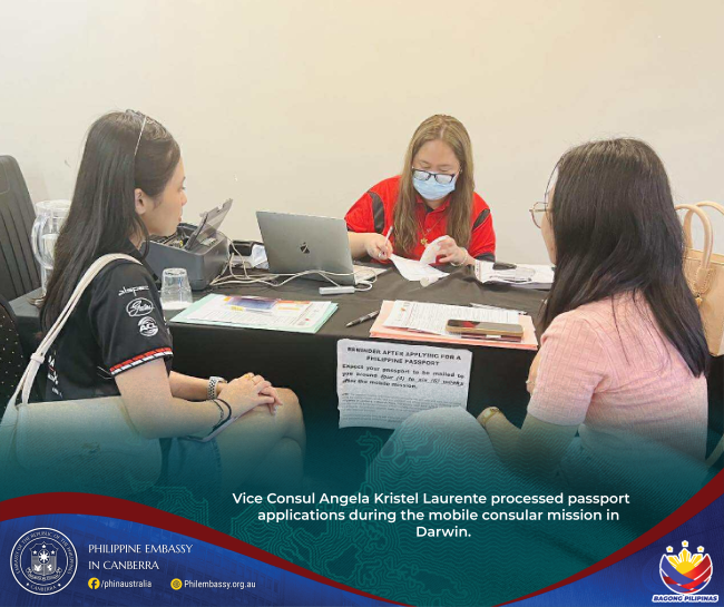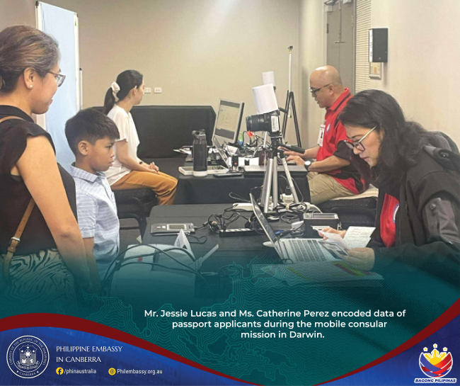 18 September 2025, DARWIN – The Embassy of the Philippines in Canberra successfully conducted the mobile consular mission in Darwin, Northern Territory from 16 to 18 September 2025. The Embassy processed 64 passport applications, 4 civil registry/notarial documents, and administered the oath of allegiance to 7 Filipinos who reacquired their Filipino citizenship through the Citizenship Retention and Reacquisition Act of 2003.