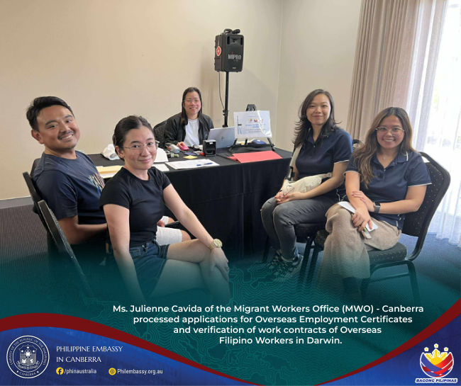 The Embassy team included Vice Consul Angela Kristel Laurente, Ms. Catherine Perez, Mr. Jessie Lucas. Migrant Workers Office Assistant Julienne Cavida also joined the team. Supported by Honorary Consul General Januario John Rivas AM, the mobile consular mission offered essential services to the expanding Filipino community in the Northern Territory, alleviating the need for them to travel to Philippine Foreign Service Posts in Canberra, Sydney, or Melbourne.