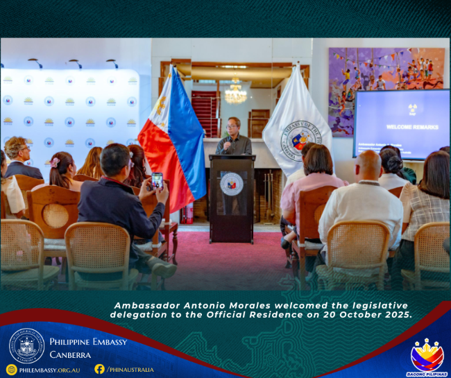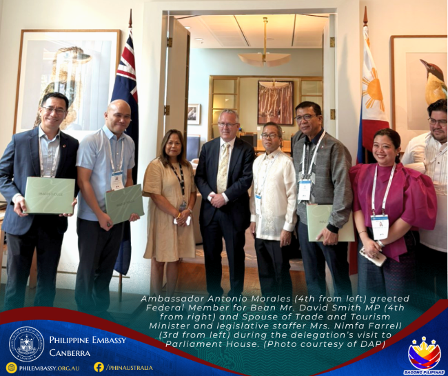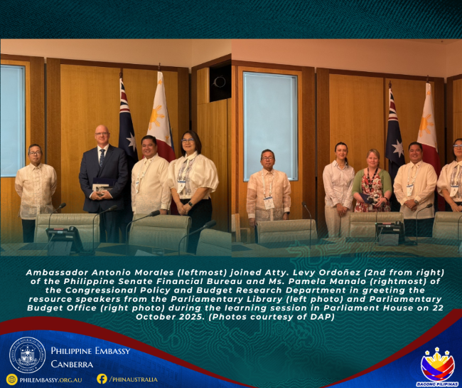 During the delegations’ courtesy call on 20 October 2025, Philippine Ambassador to Australia H.E. Antonio Morales underscored the shared democratic values between the Philippines and Australia, including a strong commitment to equality, fairness, public trust, and anti-corruption. The Embassy also briefed the delegation on the Strategic Partnership between the Philippines and Australia, highlighting cooperation in defense and security, trade and investment, socio-cultural engagement and the upcoming celebration of 80 years of diplomatic relations in 2026. Ambassador Morales also joined the delegation’s learning sessions at Parliament House.