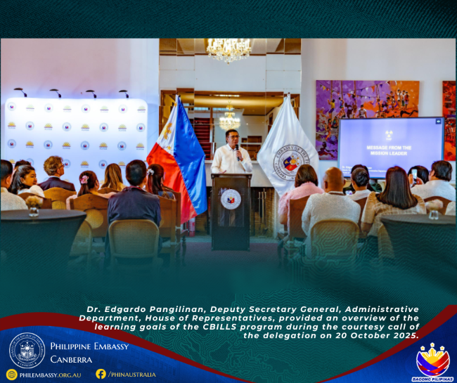 24 October 2025, CANBERRA – The Philippine Embassy in Australia actively supported the visit of Philippine Senate and House of Representatives officials to Canberra from 18 to 25 October 2025, as part of the 2025 Senior Leaders Track Capacity Building on Innovative Leadership for Legislative Staff (CBILLS) Program of the Development Academy of the Philippines (DAP).