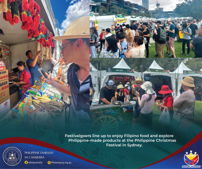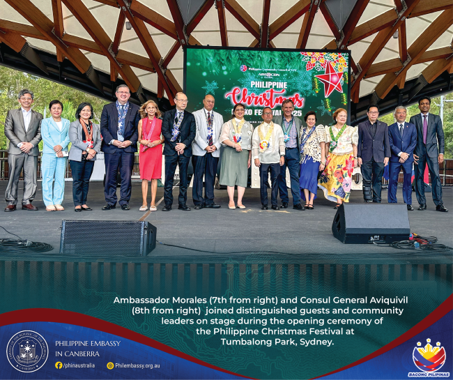 29 November 2025, SYDNEY – Ambassador Antonio Morales and Consul General Charmaine Aviquivil joined the Filipino Community in the annual Philippine Christmas Festival held on 29 November 2025 at Tumbalong Park. Organized by the Philippine Community Council of New South Wales (PCC-NSW) in collaboration with the Philippine Consulate General in Sydney, the event drew thousands of attendees who came to enjoy Filipino food, music, dance, festive tradition and the Filipino Christmas spirit in the heart of the city.