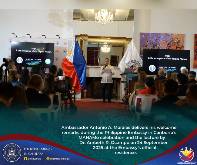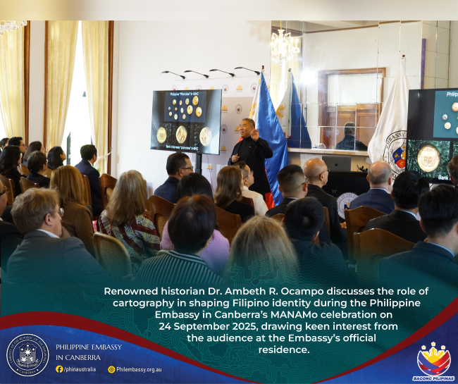 Canberra, 24 September 2025 – The Philippine Embassy in Canberra, led by Ambassador Antonio A. Morales, marked the celebration of Maritime and Archipelagic Nation Awareness Month (MANAMo) by hosting a special lecture by renowned Filipino historian Dr. Ambeth R. Ocampo on 24 September at the official residence. Titled ‘Dr. Ambeth Ocampo on Maps and the Emergence of the Filipino Nation,’ the lecture examined how maps have shaped Filipino identity and cultural heritage, highlighting the vital role of geography in the nation’s history and consciousness.