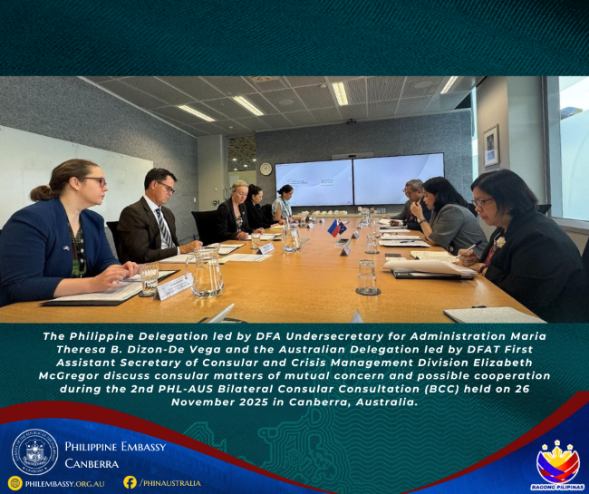 27 November 2025, CANBERRA – The Philippines and Australia convened on 26 November 2025, the 2nd Philippines–Australia Bilateral Consular Consultation (BCC) at the Department of Foreign Affairs and Trade (DFAT) in Canberra, Australia.