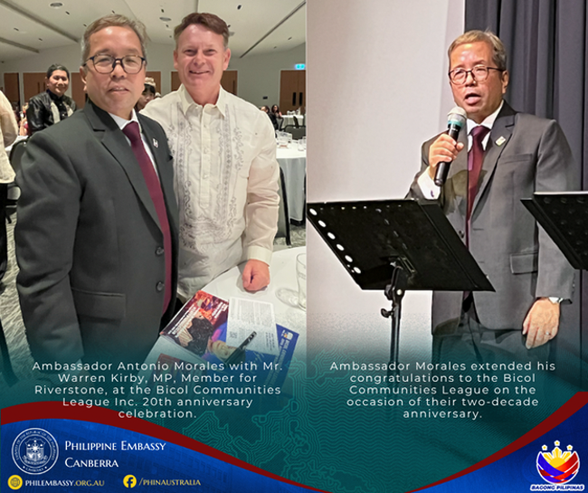 The Philippine Embassy in Canberra congratulates the Bicol Communities League Inc. on its 20th anniversary and wishes it continued success in promoting unity, heritage, and community engagement among Bicolanos in Australia - END.